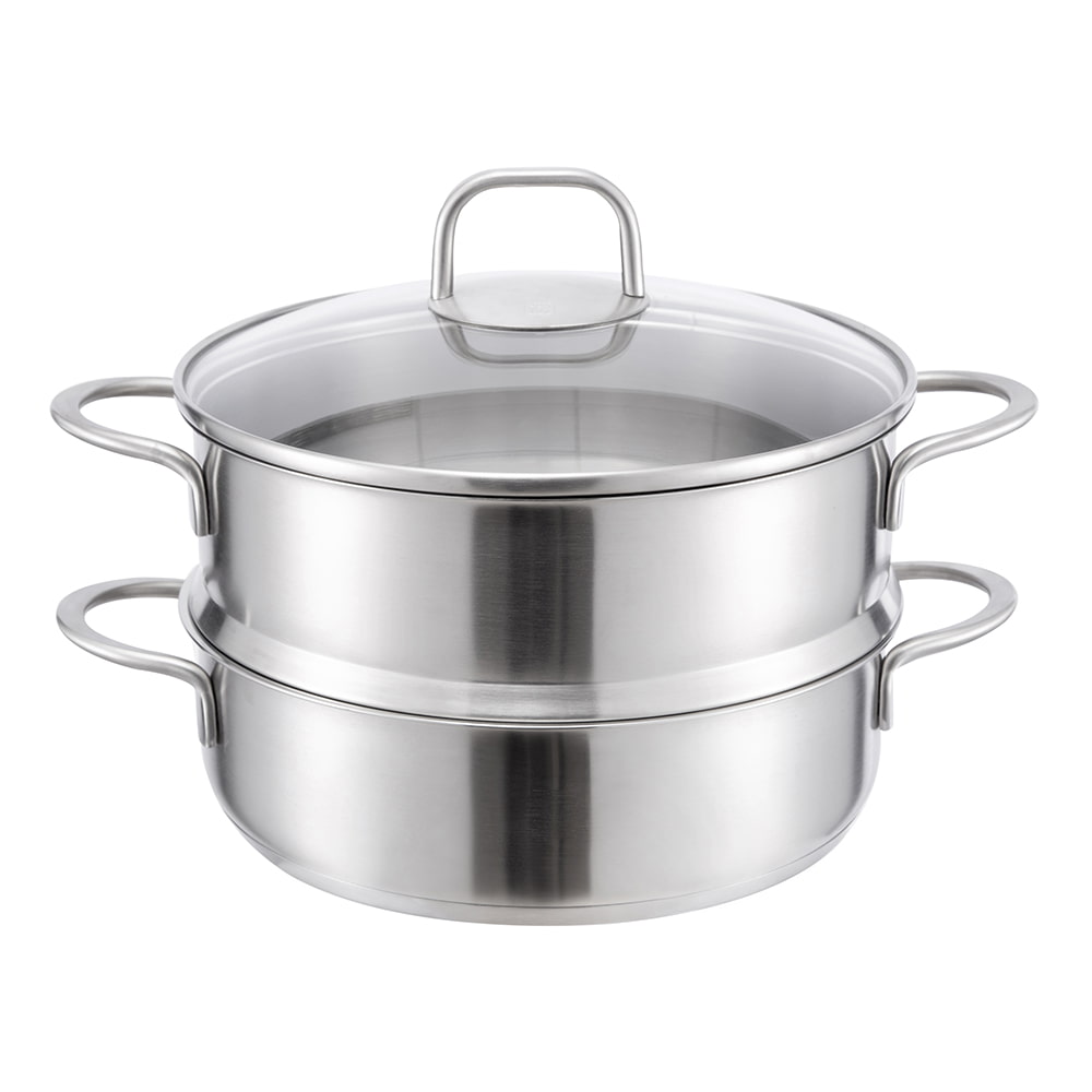 Saves time and energy: the secret is the three-ply bottom (stainless steel + aluminium + stainless steel), which distributes the heat evenly for faster cooking. This is why you can keep the heat low while cooking, which saves energy.